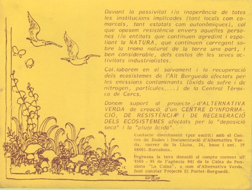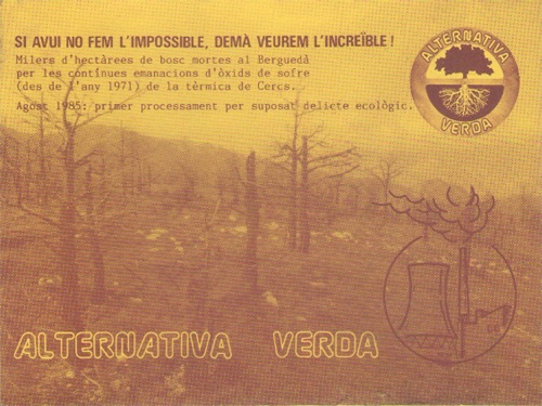 7/9/2014: Per recordar que el 7 de setembre de 1984 Alternativa Verda va exercir l'Acció Penal Popular contra FECSA pel delicte ecològic de la Central Tèrmica de Cercs, que emetía ingents quantitats d'òxids de sofre, que es depositaven als boscos d'el Portet (Vallcebre) i ocasionaven la seva desaparició, per recordar-ho, AV posa a disposició de la ciutadania la informació que es va publicar en el llibret titulat