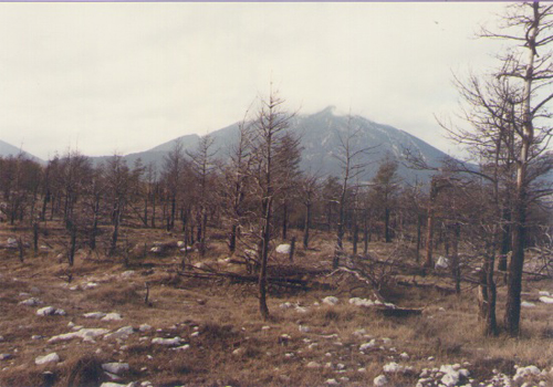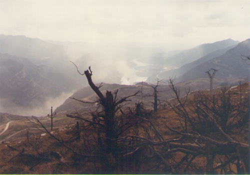 Fotografies dels boscos d'El Portet, afectats per les deposicions àcides dels òxids de sofre emesos per la combustió de lignits amb elevat contingut de sofre. A la darrera fotografia es veuen els dos plumalls: el de fum de la xemeneia de la tèrmica (sofre i polsaguera) i el de vapor d'aigua (de la torre de refrigeració), la barreja dels quals formen les deposicions àcides que ocasionen la mort del bosc (fotografies realitzades durant el reconeixemnent de la zona, per part del jutge i les parts afectades, el 30 de novembre de 1984).