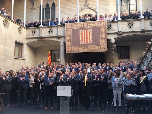 Més de set-cents batlles dels municipis que han aprovat la moció de l'ACM i l'AMI que refusa la sentència, assisteixen a l'acte del Palau de la Generalitat per reivindicar l'autodeterminació i reclamar diàleg.