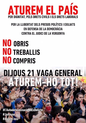 La Intersidical - Confederació Sindical de Catalunya ha convocat una vaga general pel dia 21 de febrer, a la qual ja s'han adherir l'ANC, la CUP, ERC, JxCat, Omnium i USTEC.
