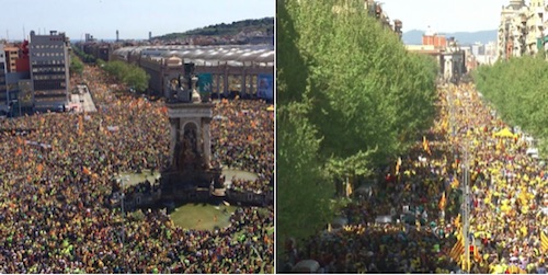 Centenars de milers de persones s'han manifestat des de la Plaça d'Espanya, seguint l'avinguda del Paral·lel fins a la plaça de les 3 xemeneies, demanant la llibertat dels presos polítics.