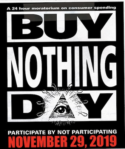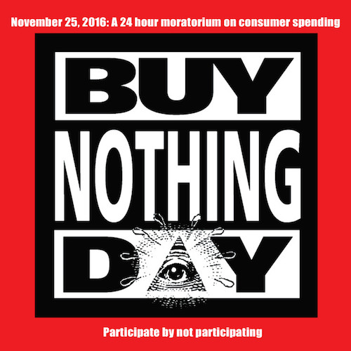 Cada any a finals de novembre (enguany el dia 28 de novembre), justament abans de començar la temporada de compres nadalenques, es celebra el ‘Buy Nothing Day’ (Diada de no comprar res), una diada per fer una crida a la moderació i a la reflexió pel que fa als ‘hàbits’ de comprar. A diverses ciutats del món i en ocasió d’aquesta diada es realitzen actes de sensibilització i d’acció per cridar l’atenció de les persones i perquè aquest Dia Sense Comprar les hi alliberi el temps necessari per reflexionar a nivell personal, familiar i col·lectiu de quines conseqüències tenen les pràctiques consumistes que es van imposant arreu.