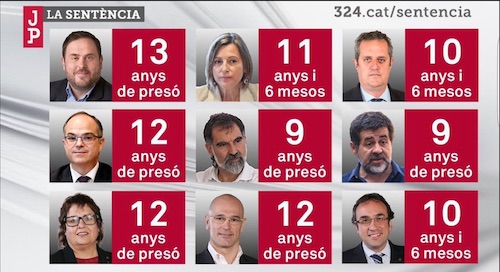 El Tribunal inquisitorial espanyol, altrament conegut com 'Tribunal Supermo' ha condemnat a 99,5 anys de presó als membres del govern de Catalunya, democràticament elegits, a la Presidenta del parlament i als líders de l'ANC i d'Omnium Cultural.