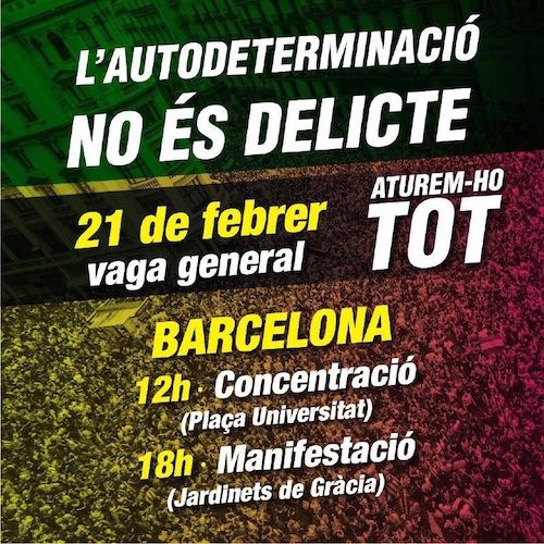 La Intersidical - Confederació Sindical de Catalunya ha convocat una vaga general pel dia 21 de febrer, a la qual ja s'han adherir l'ANC, la CUP, ERC, JxCat, Omnium i USTEC.