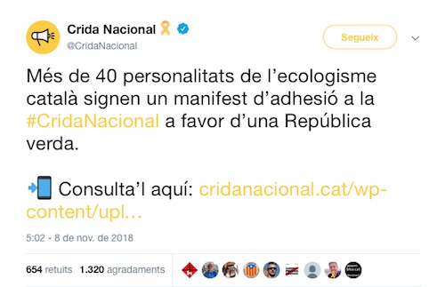 La noticia als mitjans: - Ecologistes se sumen a la Crida per “recuperar la sobirania energètica i alimentària” El Món. - Manifest ecologista per la Crida Nacional L'Unilateral.