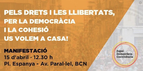 La manifestació la convoca l'Espai Democràcia i Convivència, una plataforma transversal que respon a la crida de bastir un front democràtic ampli més enllà de l’independentisme que reivindiqui l’alliberament dels presos polítics i el retorn dels exiliats.