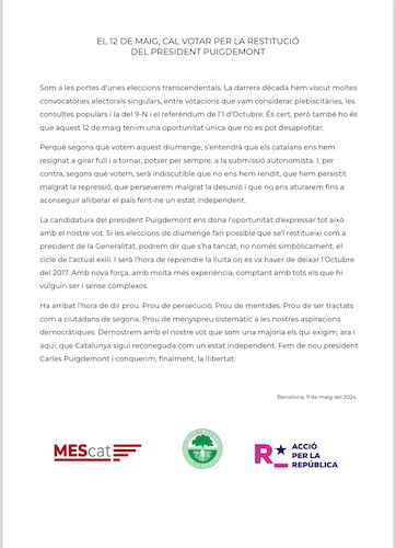 El 9 de maig s'ha fet pública una crida conjunta entre MEScat, Alternativa Verda i Acció per la República per votar per la restitució del President Puigdemont en les eleccions al Parlament de Catalunya del 12 de maig,