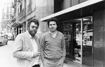 Foto: Josep Vicent Marquès amb Santi Vilanova davant la seu del carrer Consell de Cent de “Diario de Barcelona” la primavera de 1983